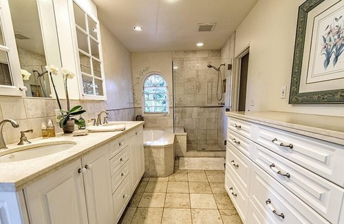 The master suite has a california king bed, on the ground floor overlooking the pool area and long views of the rolling foothills. It has a sparkling clean carrera marble bathroom ensuite, with separate shower and six foot spa tub with hydrojets.