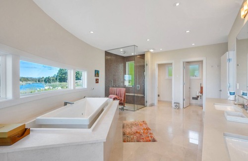 5BR + loft/6.5BA: private heated pool, hot tub, water views, balconies, open layout, workout equipment, office, loft, outdoor shower