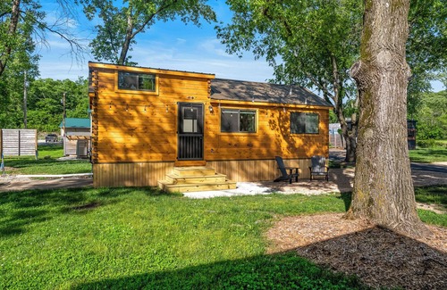 This cozy retreat offers a range of modern amenities to ensure your comfort and convenience, including a climate-controlled interior, a fully equipped kitchen, and a bathroom. With two queen beds and a twin bed loft, this cabin comfortably accommodates up to 6 people, making it ideal for families or groups of friends. Rest assured, this cabin is fully stocked with everything you need for a memorable stay. From dinnerware to luxurious bedding, we've got you covered. As you enter, you'll be captivated by the spacious and inviting atmosphere. The bedrooms provide the privacy you crave, thanks to the sliding barn doors. Pamper yourself in the fully equipped bathroom, complete with a standard shower. Looking for some evening entertainment? Take advantage of the three smart TVs and a selection of board games provided for your enjoyment.