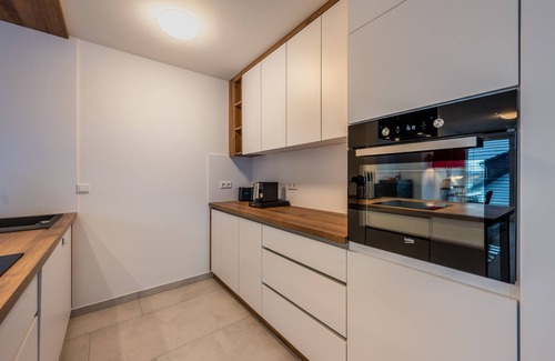 Enjoy a stylish experience in the centrally located luxury accommodation with a fireplace and a huge covered balcony. Perfect for business travelers and families. Our luxurious and modern furnished 2-bedroom apartment in the downtown of Böblingen with an open floor plan and bright rooms, which make this apartment an exceptional place. We offer a great and open kitchen with cooking island, a king-size bed and a high-quality leather couch with sleeping function.