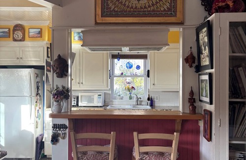 Absolutely charming cottage with a view to the ocean and located in the original village of Laguna Beach. A perfect location on a quiet tree lined residential street three blocks... a four minute walk... from the ocean. One can walk easily to town to enjoy all the many and varied attractions of this wonderful artist's community. The house itself is uniquely decorated to create a quiet zen space that is soothing yet luxurious... The front deck has a view of the ocean only a short walk away. The beaches of Laguna Beach are well know for their beauty and is one of the surfing capitals of the world. The restaurants and art galleries are unparalleled. Laguna beach is the home of the world famous 'Pageant of Masters'... a unique experience that draws people from around the world. Those who have stayed in this unique cottage have raved about its charm and warmth. It is a perfect spot for a unique and relaxing vacation...!