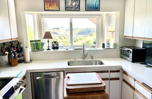 The views are gorgeous! The weather is outstanding. The beds, pillows and sheets are new and very comfortable. The kitchen is fully stocked with every appliance and condiment. The patio is for lounging or eating, and the kids can play on the artificial turf in the patio area, or in the quiet cul-de-sac. The many green belts this neighborhood provides, or at the ocean view Buddy Todd Park at the end of the street, gives many options for recreation. Outdoor toys, balls, badminton racquets and a cross terrain bike are provided for play.
