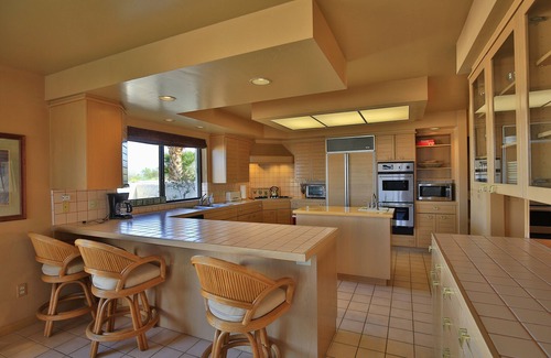 All on one level, our home can comfortably sleep 6, with three roomy bedrooms and 3 1/2 bathrooms (2 are en suites). The kitchen is very large and well equipped, serving a more formal dining room and pass-through bar as well as a casual eating area. A natural-stone gas fireplace stands ready to ward off the chill of a cool evening. The laundry room features a full-size washer & dryer, and there is room for two cars in the garage. (Note: All cars must be parked either in the garage or in the driveway; Rams Hill does not allow street parking.) Our home is fully walled and gated, with some grassy areas, making it suitable for a furry guest!*