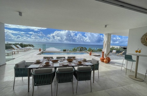 This incredible villa, offered by Antilles Exception, is located on the heights of a cliff overlooking Anse des Rochers, offering an exceptional view of the Atlantic Ocean and its islands (Marie-Galante, Les Saintes, Dominica).