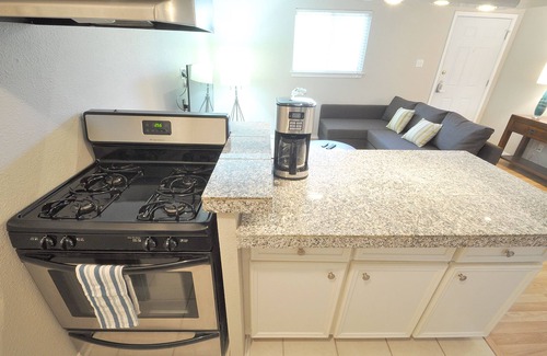 You will love the open concept Living Room! The floor-plan is a great use of space for relaxing and watching the wall mounted 50" TV on the sofa bed couch, dining in the dining area on a modern Tulip table, or cooking in the feature and appliance complete kitchen.