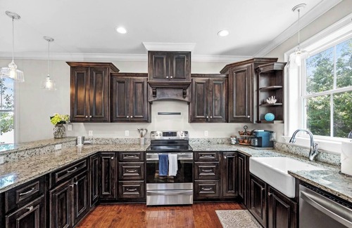 As you enter the home, you will find there is a open family room and dining area where family can stay connected while visiting and sharing family meals. The kitchen has chefs knives, blender, toaster, microwave and plenty of baking and cooking supplies for the families that enjoy cooking together. The kitchen features granite countertops, a large refrigerator, electric stove, oven, dishwasher, microwave and blender. We include a Keurig Combo coffee station with Kcups, coffee grounds, creamers and sugars. The kitchen also features additional bar seating for three.