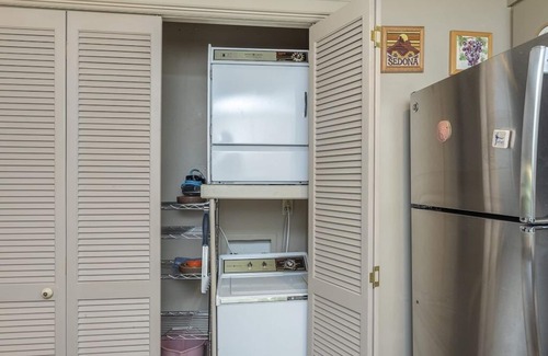 Once inside, steps lead down into a comfortable living area with a queen sleeper sofa, television, and dining table with seating for four. Sliding glass doors lead to a rear deck overlooking the first fairway of Bald Mountain Golf Course. The master bedroom has two queensize beds, full bath, and atelevision. The second bedroom offers twoqueen-sized beds, full bath, a futon, andatelevision. With fiveseparate beds, this condo has a spacious feel and is a great choice for families vacationing or golfers who want the additional savings of a fifth player in the same unit.