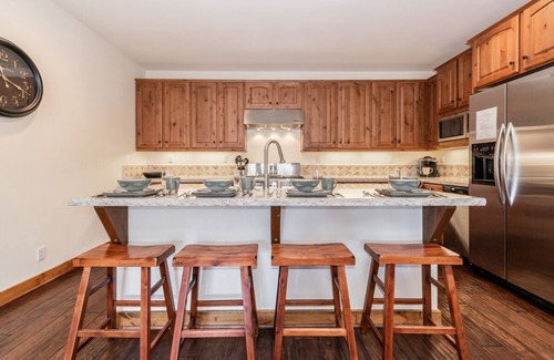 Head upstairs to find the spacious great room with vaulted ceilings and picture windows allowing in lots of natural light. A rich leather sofa and recliner frame a charming wood coffee table, 75” Smart TV, and cozy fireplace—creating an inviting space to gather after a day on the slopes. Enjoy homemade meals at the hardwood dining table for 4 dividing the living space from the chef’s kitchen, designed with high-end appliances, hardwood cabinetry, and granite countertops. An additional 4 seats at the breakfast bar offer room for entertaining mini sous chefs or enjoying a relaxed cup of coffee before hitting the mountain. Off the living space is a private deck with views of the Sherwin Mountains, a bistro set, and a gas grill. At the end of the night, guests can retire to the home’s primary bedroom, featuring a king bed, Smart TV, and a luxurious private bathroom. The guest bedroom has a queen bed, a private bathroom, and Smart TV. There’s also a kid-friendly bunk room with 2 twin-over-twin bunk beds and a twin trundle.