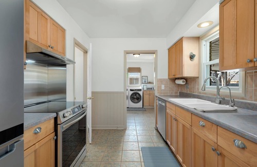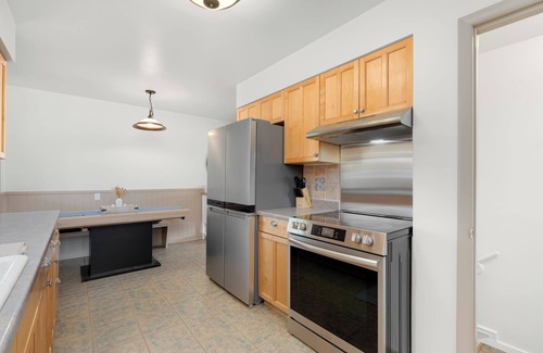 The backyard features a large yard and covered patio for your enjoyment and grilling desires. Full kitchen with new appliances and cookware. Both areas can serve as dining areas. There is also 1 Gig internet available for use.