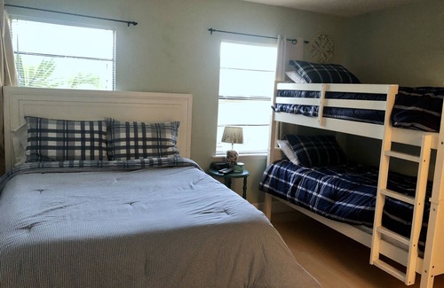 The second bedroom is equipped with a Queen bed and bunk beds, a flat-screen TV, and another en-suite full bath. Enjoy watching your favorite shows or movie night on a big screen TV and the new comfy sofa that holds a Queen sleeper to accommodate guests.