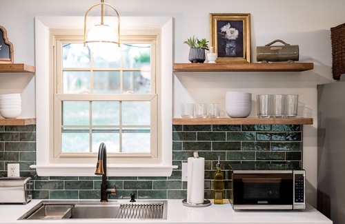 K i t c h e n > Provides everything needed for cooking and preparing meals; full range electric stove top, pots and pans, cooking utensils, knife set, cutting boards, strainer, water filter pitcher, microwave, electric tea kettle, french press, toaster, dinnerware, and silverware. Additionally, we also provide kid-friendly plates and cups.