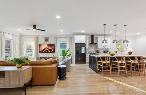 Discover a brand-new home in a serene neighbourhood near top-tier shops and dining. Immerse yourself in designer furnishings and decor, complemented by a charming Southern front porch complete with a swing bed. The fenced backyard offers a safe haven for children and pets. Enjoy high-speed WiFi, TVs, and desks in every bedroom.