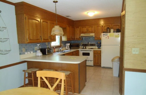 We are an affordable, comfortable home located mid block on the popular west end of the island. The living area and dining room (seats 6) are just off the kitchen with a 3 seat breakfast bar. There is a TV and DVD player in the living room, and another TV in one of the bedrooms. The house has 4 bedrooms total, 2 on each side of the house. Each side has one bedroom with a Queen size bed, the other has 2 twins, with a Jack and Jill bathroom between, perfect for 2 young families to share. If you want to be outside you can enjoy coffee on the screened front porch in the morning, and husk corn for dinner or just lounge on the back deck in the afternoon.Your pet will enjoy the view from either porch too. Under the house there is plenty of room for side by side parking, and the kids will enjoy a swing, table and chairs for snacks or games, and concrete pad for their chalk artwork. There's an outdoor shower and hose for rinsing off that sand and sunscreen!