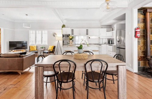 • Open-plan Dining ~ Kitchen bench stools, Dining Table setting for 6, Decorative Pot Belly Fireplace, Sideboard