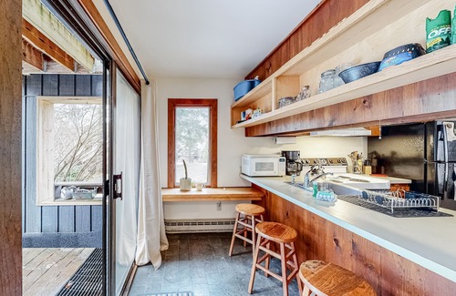 As soon as you arrive, you will be greeted by the unique black exterior that gives this abode a modern mountain feel. Step inside, and everyone will fall in love with the spacious layout boasting an inviting living area with a flatscreen TV and wood stove, a full kitchen for preparing tasty recipes, and a desk to get a bit of remote work or school done if need be. Streaming is also available using high-speed WiFi, so there will be no lack of entertainment during downtime. Come summer, don't forget to head out to the private deck to sip a cocktail at sunset with the company of loved ones.