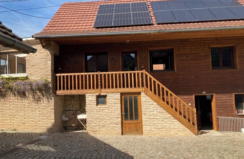 The farm is managed, we live opposite. The farm has also a few pets: dog, cat, chickens, ducks, horse and pony. The apartment has its own entrance and is on one level; the bathroom has a large shower and a washing machine. The toilet is separate. From the kitchen a glass door leads directly to the veranda. The kitchen is new and has an induction stove, oven / microwave, dishwasher, coffee maker and kettle as well as dishes, pots etc. Tea towels and towels are provided. The dining area can be varied: kitchen, dining room, veranda or in the open under the quince tree or in the sun. The apartment can be reached by stairs front and back, without any steps, which is for disabled advantageous.