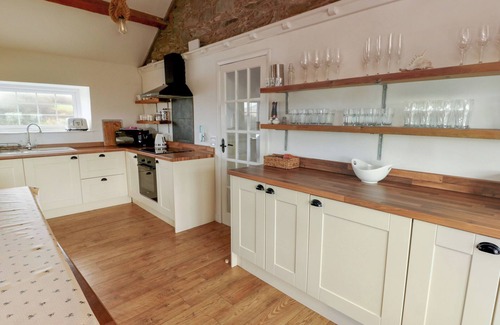 Fferm Porthdafarch South Farm House is a reverse-level house, consisting of a kitchen with an electric oven and hob, fridge, microwave, dishwasher, coffee maker, kettle, and toaster, a utility with fridge/freezer, washing machine, and tumble dryer, a dining room seating eight guests, a sitting area with woodburning stove and Smart TV and a ground-floor sitting room with a woodburning stove and Smart TV. The bedrooms consist of a super-king-size, double, double with en-suite shower, and bunk, serviced by a bathroom. WiFi, fuel, power, bed linen, and towels are included in the rent. Outside, there is a front garden with gravel and furniture, and off-road parking for two cars. Within 1.9 miles you will find a shop, 1.7 miles a pub and 0.1 miles a beach. Three well-behaved dogs welcome. Sorry, no smoking. Enjoy the view from all windows at Fferm Porthdafarch South Farm House.