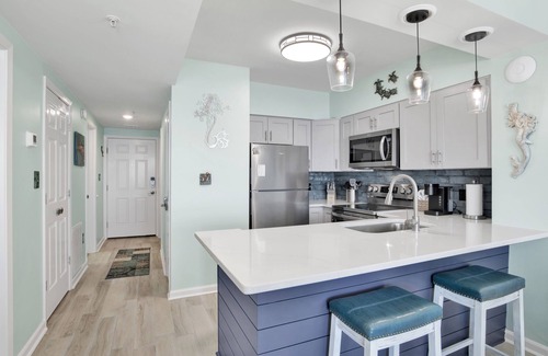 The comfortable master suite has a king size bed, balcony access and an en suite bath with a newly tiled tub/shower combination and updated cabinetry and counters. The second bedroom has a Queen bed perfect for a second adult couple or kids. The second full bathroom also boasts a gorgeous newly tiled walk-in shower and updated cabinetry and counters. Both bedrooms feature blackout curtains for the late risers! The living area has balcony access, a queen sleeper sofa, and blackout curtains. The updated full kitchen has beautiful new cabinetry, new countertops and new stainless appliances. There is also a washer and dryer in the unit for convenience. The dining table seats four and the breakfast counter offers two additional seating options.