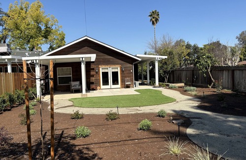 I added a studio apartment to my home that I would want to live in. I needed it to be fully independent and have its own entrance, yard and garage. It was important to build it so that the beauty of the spacious outside is pulled in with large double pane windows and French patio doors. A fence with hedges in the back yard and an extra thick interior wall ensures that independence and privacy is ensured between the main house and the studio.