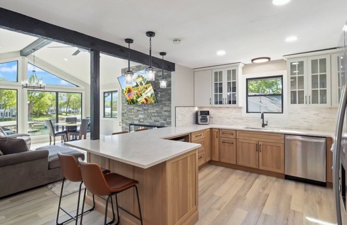 Absolutely everything you need for an epic lake vacation! Fire pits, hot tub, slide, beach, kayaks, sand volleyball, arcade room - Water's Edge has it ALL! Enjoy great space in the main house & guest house. Cozy up by the electric fireplace or unwind at the bar. With two homes connected by a country lane you'll have plenty of space for generations to gather. Experience it all at Waters Edge on Burning Bush Drive!" Nestled in a quiet cove, you'll feel at ease letting kids play on jet skis and kayaks, and more for everyone at Waters Edge!