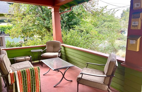 Gorgeous first floor apartment in classic Portland style 1911 Alberta Arts craftsman. This light filled one bedroom is the perfect overnight stay for up to four people with a queen in the bedroom and a 60x70 sleeper sofa in the living room. Large kitchen includes full size refrigerator and stove, and has an adorable dining nook. Wide and elevated front porch with sunset views offers a great place to relax outdoors, rain or shine!