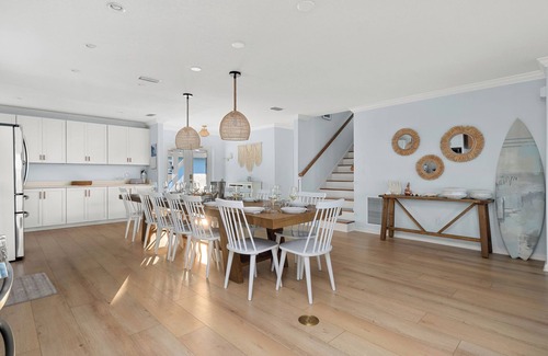 Escape to your ultimate beachfront retreat in Flagler Beach. This ocean-view home features 4 bedrooms, including a bunk room with 5 beds, a private mother-in-law suite, and a master suite with an enclosed balcony and breathtaking ocean views. Enjoy 3 ensuite bathrooms, a fully stocked kitchen, and an outdoor patio with a swinging couch, cornhole, and life-size games. With surfboards, Paddle Boards and Boogie included, adventure and relaxation await! Potential for Golf Cart rental with home.