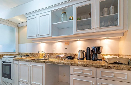 Na cozinha com bancada, super equipada, todos ítens necessários para sua hospedagem. Pro hóspedes que preferem cozinhar a cozinha conta com utensílios básicos para uma ótima hospedagem.