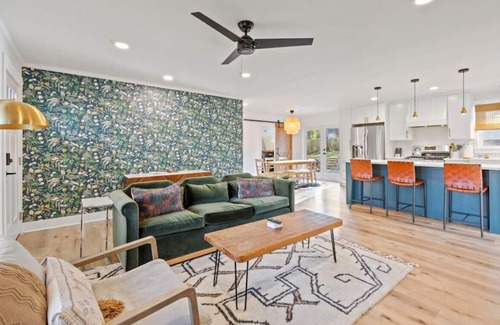 The living room's jewel is the beautiful accent wall with a whimsical wallpaper pattern, which was the inspiration for the name of the house. Rest and relax on the custom emerald green sofa or comfortable accent chair. Our television is a smart tv and allows guests to stream with their services (no cable). Our gas fireplace is usable with just the turn of a knob and allows for a cozy evening in. Kick your feet up and relax!
