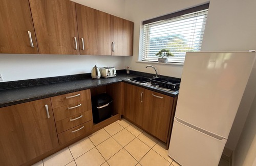 The spacious open-plan living area is designed for relaxed get-togethers, with a fully equipped kitchen, breakfast bar, dining space and bi-fold doors opening out to the garden—perfect for summer evenings and indoor-outdoor living. A smart TV, cosy sofa, and fast WiFi make it just as enjoyable in cooler months.