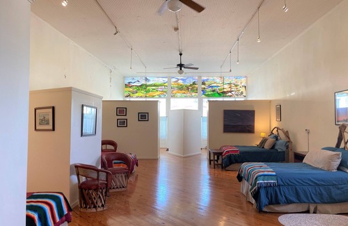 We transformed the Art of the Prairie Gallery into this unique lodging experience. Soaring 20 foot ceilings lets you all rest without ever feeling claustrophobic. Sleeps 6 with everyone in their own bed. Or experience it on your own. Located downtown walking distance from restaurants, shopping & coffee & grocery store. Travel Kansas off the beaten path.