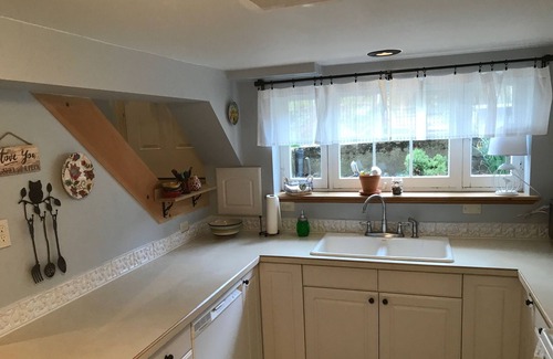 Kitchen is well stocked with dishes and utensils for cooking and serving, and this unit stays very cool on hot summer days without air conditioning!