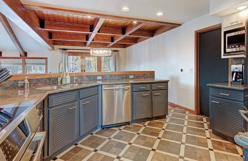 The living area is peaceful and inviting with hardwood floors, exposed wood beams, and modern furniture. An iron gas fireplace is built into a stone wall, and above it, a flat screen TV. Large windows surround the room for amazing forested views. There is a spacious dining room with a table that can seat up to six guests. Nearby, a breakfast bar has additional seating for seven more guests. The breakfast bar wraps 90 degrees around a gourmet kitchen outfitted with custom wood cabinets, granite countertops, and stainless steel appliances. The kitchen is perfect for cooking large meals or gathering with your group. In the walk-in pantry, theres a washer and dryer as well. There is a beautiful outdoor space with a private hot tub.
