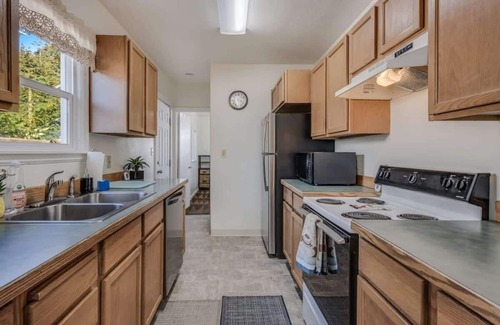 The galley kitchen features all main appliances including a fridge, electric stove, oven, microwave & a dishwasher to make clean up easy! Basic countertop appliances such as a drip coffee pot & toaster are also available. Everything you may need to create a delicious meal from cookware, plates, glassware, & utensils are available here at the Downtown Charmer.