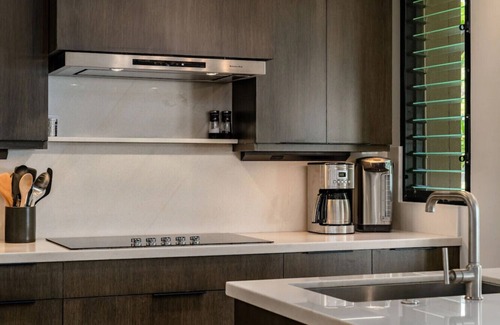 The highlights of our villa is firstly, the wraparound lanai that has perfect sunset views that span 120 degrees from over Ulua Beach to the pool and enjoy perfect privacy. Our villa is located at the front of the front row of Elua Resort. The second feature of our villa is our modern and expansive kitchen that is open to the living room and dining area. Everyone is connected no matter where you are in Villa 1002, whether on the lanai or in the living room or dicing fresh vegetables, everyone can remain connected to one another.