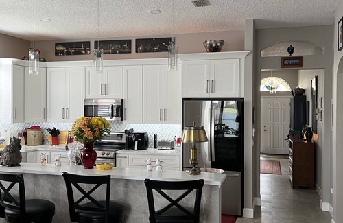 Full Kitchen with new LG appliances. Stove with double ovens, over stove microwave, Refrigerator with see in glass, Dishwasher and large Farmhouse sink. Quartz counter tops in Kitchen and both bathrooms. Porcelain tile floors in entire home. Kitchen Island with 4 high stools for additional seating. Breakfast nook off the kitchen great for casual meals and card games. Kitchen equipped with all utensils, pots and pans and dinnerware. Large family room/den with leather sofa, love set and recliner, all overlooking the beautiful pool, patio and lake. 65" Smart TV with 300 channels and most premium channels such as MAX, Hulu, Showtime, Prime, Netflix and others. High speed internet throughout the house at 1,000mbs. Wireless printer online.