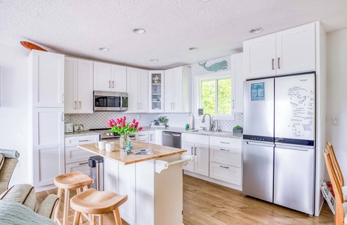 This inviting, beautifully updated home has ocean views and beach access nearby, with a side patio for relaxing around the fire pit under the stars while the ocean roars. You’ll be off the beaten track, but minutes from all that Lincoln City has to offer. Sleek new floors, beach décor, contemporary furnishings, and thoughtful updates take this home to the next level for an exceptional beach stay. Gather in the living room for TV and a fire; a queen sleeper sofa accommodates extra guests. A sweet, fully updated kitchen with a breakfast bar island, a pretty ceramic backsplash, stainless steel appliances, and quartz counters is next to a dining nook for six. A sunken king bedroom is practically a suite—once guests have gone upstairs to bed, close the door and the bright, open full bath with steam shower is all yours, and you’ll have a separate entrance for private walks on the beach.