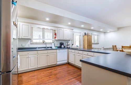 The front door is located up the steps on the river side of the home. On this front deck you will find an outdoor sofa with a gas firepit and a bench swing at the far end. Upon entering the property you are in the open space of the living area, a four-chair sitting area, the dining area with 8 chairs and the full kitchen. The living room features a new gas-log fireplace, a television and a built-in bookcase filled with reading options. Streaming satellite tv is available on both the upstairs and downstairs televisions, providing live news and your favorite sports channels. The kitchen is a chef's dream, with cabinets and counter space every where you turn! Not only are there full size appliances, including a refrigerator, dishwasher and microwave, but the highlight is a gas stove and oven. In the pantry you will find a toaster oven, a lobster pot, a toaster, an air fryer, a crock pot and a blender. The Keurig coffee maker can make a 12-cup pot of coffee or a cup at a time with K-cups.