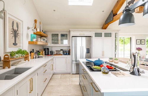 From the parking area in front of the garage, steps lead onto the covered balcony, with an outdoor dining and sofa area near the front door. Upon entering Gamekeeper's Lodge, you are welcomed into the airy, vaulted entrance hall with a chevron tiled floor, where there is a baby grand piano and a picture book window overlooking the back garden. To the left, the blue boot room has an oak seating bench and plenty of space for coats and shoes. The staircase leads down to the long hallway on the ground floor along with the four double bedrooms, with en-suites.