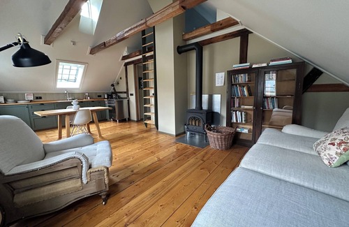 Upper Floor Apartment South : The upper floor has a private entrance . We have one Bedroom with a King Size bed (180x200 cm) that can be converted into two single beds (90x200 cm). The bathroom has nice shower, in the living room we have a comfortable sofa that converts into a Queen Size bed (160x200 cm).