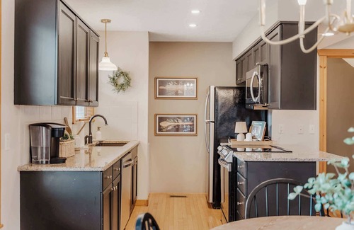 This home comfortably sleeps up to 4 guests between a private bedroom and a queen-size sleeper sofa in the living area. The bedroom is located on the second floor and features a king-size bed, Smart TV, and ensuite bathroom with a walk-in shower, soaking tub, and pedestal sink. There is a half bathroom on the main level as well!