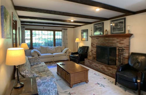 The property can easily accommodate a large family (or a work team) that wants to get together in comfort and style in a lovely, quiet, country setting. With 4 generous-size bedrooms upstairs, a library with 2 additional full-sized beds, small study table, couch, and a second TV, a family room with a fireplace and a living room with a piano (and sleeper sofa), there's lots of options for a group up to 14 (or more with some prior approval and planning). It is on 33 acres, but only 10 minutes straight down the road to town, providing excellent shopping and restaurant choices nearby (and many offer home delivery).