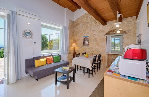 A well-lit living room overlooks the terrace and has a sofa bed, satellite TV and DVD player.