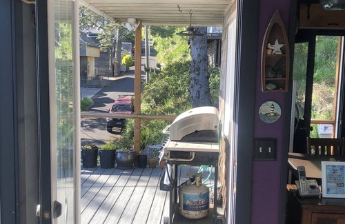 Cape Escape is a charming nautical cottage with excellent views, located in the hills of Oceanside, Oregon. Parking is directly in front of Cape Escape, there are over 30 stairs to get to the front door! The cottage is 700sqft with 2 bedrooms and one small(!) full bath. There are 3 stairs to get to the bathroom and bedrooms. There’s a full/stocked kitchen with small 4 person dining area. The living room seats 6 and has an incredible view of the Pacific Ocean, a very large vhs collection, g00gle chrome cast, an original Nintendo and Wi-Fi. There’s a large deck attached to the living room and kitchen with a beautiful succulent garden. The bedrooms are both small, one has a king bed and a tv with g00gle chrome cast, the second bedroom has a queen bed with a tv with vhs.