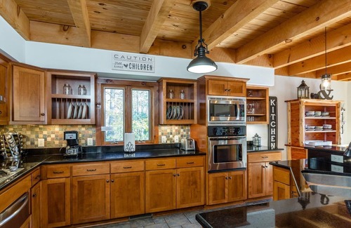 As you approach this spacious cabin, you'll immediately notice the large deck that spans two sides, offering incredible views of the valley and mountains during the fall and winter months. Inside, you'll be surrounded by the rustic wood and stone of the open living space. The living room has a leather sofa, a cathedral ceiling, and floor-to-ceiling windows, while an additional living area boasts a sectional couch, electric fireplace, rocking chair, and flat screen cable TV. A sliding glass door provides access to the deck where you'll find a hot tub to soak your stress away. Prepare a home-cooked meal in the fully equipped kitchen with stainless steel appliances and beautiful wood cabinetry. The island has a double sink and dishwasher, along with tall stools at the raised countertop, and the dining table has seating for six. Outside, you can cook on the grill while the kids play on the playground equipment.