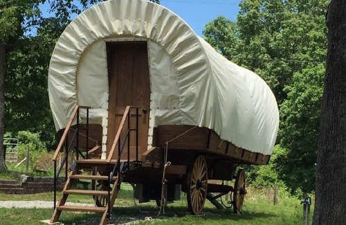 The Catawaba Trail Wagon has a king size bed with a 8" memory foam mattress as well as a set of bunk beds with memory foam mattresses as well. There is a table, mini fridge, and a coffee pot. The Wagon has electricity with plug ins, USB ports, Heat & Air!