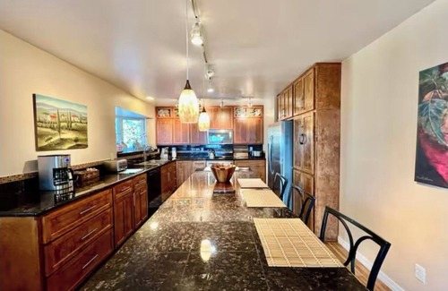 As you walk into this beautiful four bedroom home in the suburbs of Gold beach Oregon the living room has a large picture window that has ocean views and beautiful sunsets. It has an open living space with plenty of seating. It’s a great place to sit by the cozy fireplace and watch TV or play your favorite game at the large dining table. It has a beautiful kitchen with granite countertops that’s fully stocked with coffee bar and any thing you would need to cook up that salmon you caught on the nearby rogue river. It has a long breakfast bar that you can sit at or a table that seats eight in the dining. The upstairs has a master suite with a comfortable king bed and a shower bath combo, there is also a large screen TV. The second bedroom has a comfortable queen bed and adjacent to that is a bathroom with a shower bath combo. There is also a washer and dryer upstairs. Every room is supplied with soft linens, blanket’s plenty of towels, shampoo and laundry detergent. As you go down the spiral staircase, it opens up into another living space with TV, a breakfast kitchenette an extra refrigerator washer, dryer, 2 bedrooms with queen beds, and another bathroom with a shower. It has a large fenced yard with a propane barbecue and picnic table on the deck below. There is plenty of parking and it is a ten minute walk to the beach. We thank you so much for staying at our home and are always available give us a call if you have any questions during your stay.