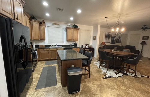 Kitchen: Fully stocked kitchen with solid oak cabinets and granite countertops, dishwasher, large pantry, dining table for four that expands to six and bar with seating for two. Everything you need to prepare delicious meals is present with bowls, pans and skillets, serving trays, etc. The many appliances include but are not limited to a hand mixer, Insta-pot, air fryer, blender, bullet mixer, toaster, microwave, garbage disposal,regular coffee maker (for those who prefer a pot) or a Keurig (for those who prefer to make coffee by the cup. )