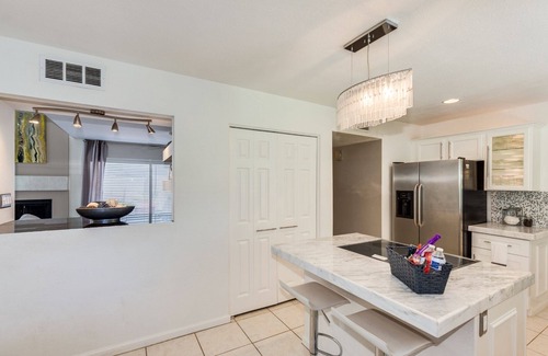 This beautiful condo overlooking golf course, 8th hole, sleeps 9. Offering everything you need for a weekend vacation or long term stay. Three bedrooms, two bathrooms with living room and loft. Master suite is on the first floor over looking a private patio. 2nd bedroom offers queen bed, & 3rd offers bunk bed with full mattress on bottom and twin on top. Loft with desk, and full size futon. Three TVs, covered parking for one vehicle, private laundry inside condo. Golf course has been recently remodeled. Condo is just minutes from Peoria Sports Complex where the SD Padres and Seattle Mariners play. Also, near Arrowhead shopping area, Thunderbird Mountain Preserve for great hiking, and Lake Pleasant. Short drive to West Gate, and Cardinals Stadium. Only 20-30 minutes from downtown Phoenix, Scottsdale, and the airport.