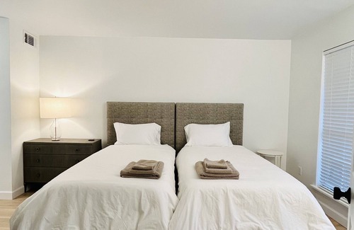 Downstairs main bedroom with two twin beds and a desk. Downstairs main bathroom with walk-in shower and double sinks.