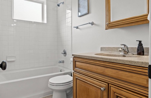 BATHROOM: The bathroom is equipped with shampoo, conditioner, body wash, fresh towels, and a hair dryer.